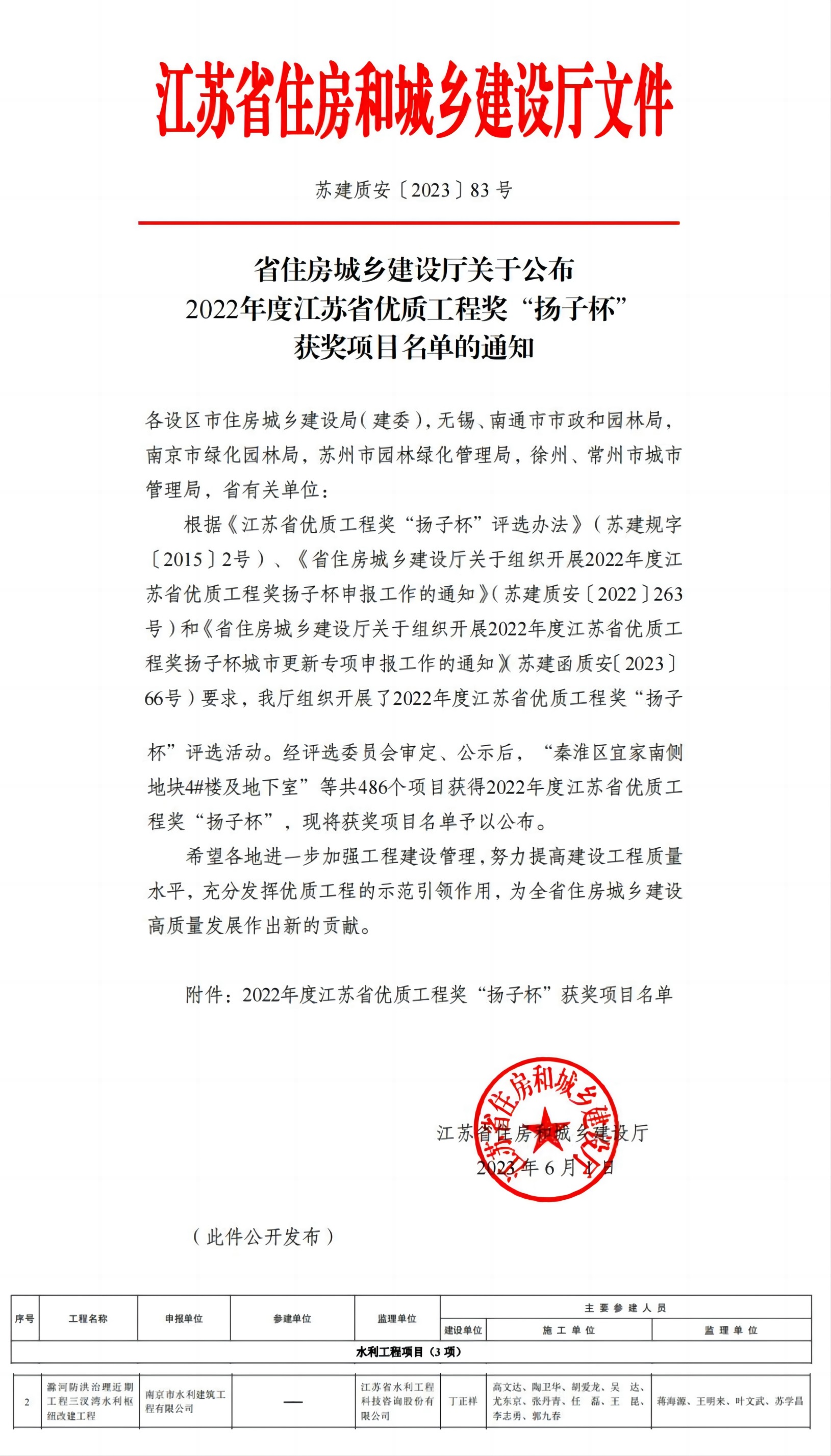 近日,根據江蘇省住房和城鄉(xiāng)建設廳發(fā)布的《省住房城鄉(xiāng)建設廳關于公布2022年度江蘇省優(yōu)質工程獎“揚子杯”獲獎項目名單的通知》(蘇建質安〔2023〕83號),由我公司監(jiān)理的滁河防洪治理近期工程三汊灣水利樞紐改建工程榮獲2022年度江蘇省優(yōu)質工程獎“揚子杯”稱號。 滁河防洪治理近期工程三汊灣水利樞紐改建工程位于南京市六合區(qū)龍池街道滁河主河道上,滁河主河道上,滁河流域系長江下游左岸一級支流。工程概算總投資7596.05萬元。2012年12月1日開工,2014年1月10日完工。該工程由船閘、節(jié)制閘兩部分組成。主要建設內容有拆除重建節(jié)制閘,設計流量為400m3/s,節(jié)制閘共3孔,每孔凈寬12m;拆建船閘上、下閘首及控制室,船閘最低通航水位6.2m,最高通航水位8.5m;拆除重建上下游翼墻及下閘首交通橋;更換上下游閘閥門、液壓啟閉機及電氣設備;移址新建閘管所;改建三汊灣水文站。 "揚子杯"是江蘇省建設工程質量最高榮譽獎,每年評審一次,代表著省內當前工程建設質量的最高水平。
