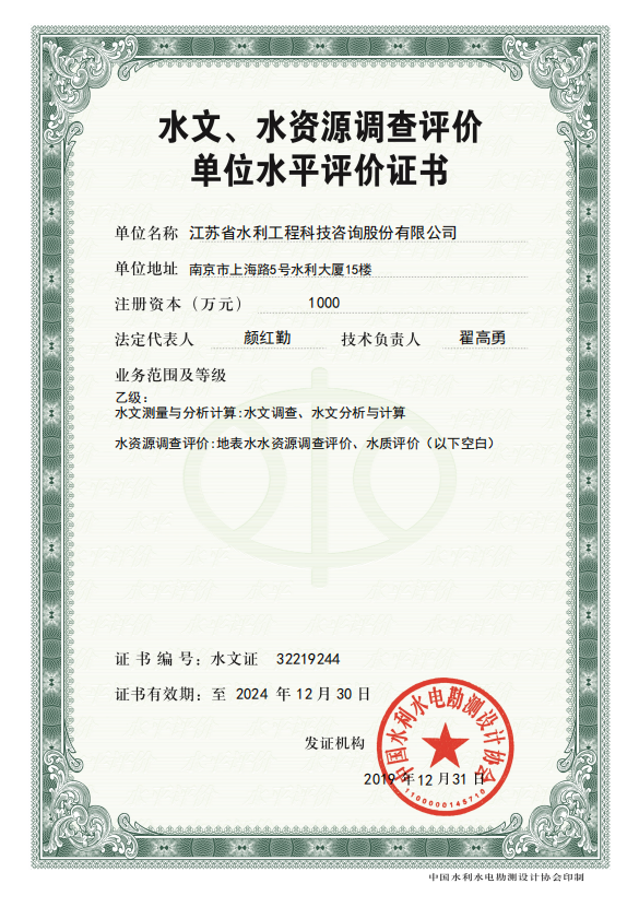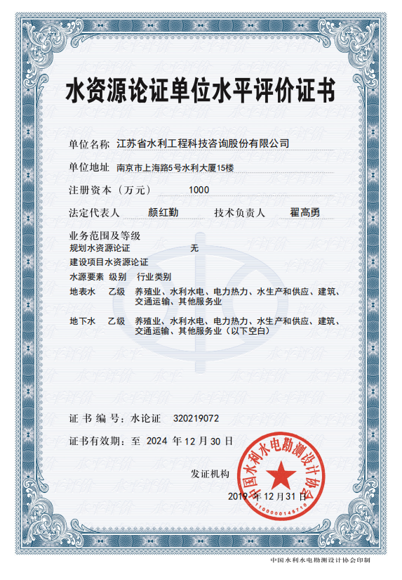 我公司取得水資源論證單位水平評(píng)價(jià)、水文水資源調(diào)查評(píng)價(jià)單位水平評(píng)價(jià)乙級(jí)證書(shū)作者:admin 來(lái)源: 日期:2020-3-11 14:16:38 人氣: