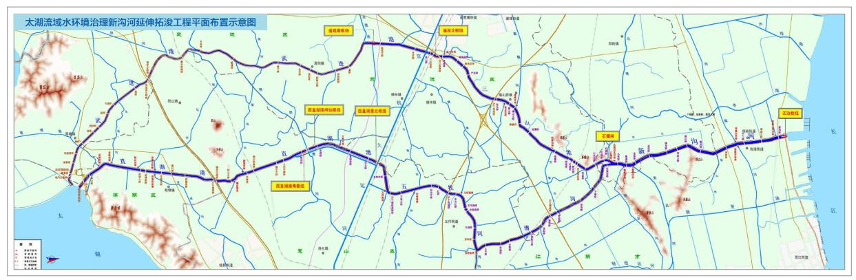 新溝河延伸拓浚工程(以下簡(jiǎn)稱“新溝河工程”)位于常州、無錫兩市境內(nèi),沿線經(jīng)過無錫市濱湖區(qū)、惠山區(qū)和江陰市,常州市天寧區(qū)、新北區(qū)、武進(jìn)區(qū)。工程主要建設(shè)內(nèi)容由河道延伸拓浚工程、堤防工程、護(hù)坡護(hù)岸工程、閘站樞紐工程、跨河橋梁工程、口門控制工程和水系調(diào)整工程等組成。其中河道延伸拓浚工程97.47km,新建和加固堤防111.84km,修建堤頂瀝青防汛道路83.35km,上堤道路3.15km,護(hù)坡護(hù)岸工程79.17km;修建閘站等樞紐建筑物8座,跨河橋梁105座,口門控制28處(其中封堵6處);水系調(diào)整工程河道疏浚59.14km,護(hù)坡、護(hù)岸6.81km,建設(shè)排澇、灌溉閘站25座,橋梁2座,排水管道500m。批復(fù)總投資56.4659億元。