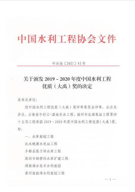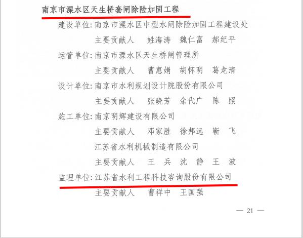 我司完成的世行貸款淮河流域重點平原洼地治理工程泰東河工程(技術(shù)咨詢)、南京市溧水區(qū)天生橋套閘除險加固工程(建設(shè)監(jiān)理)喜獲2019—2020年度中國水利工程優(yōu)質(zhì)(大禹)獎。